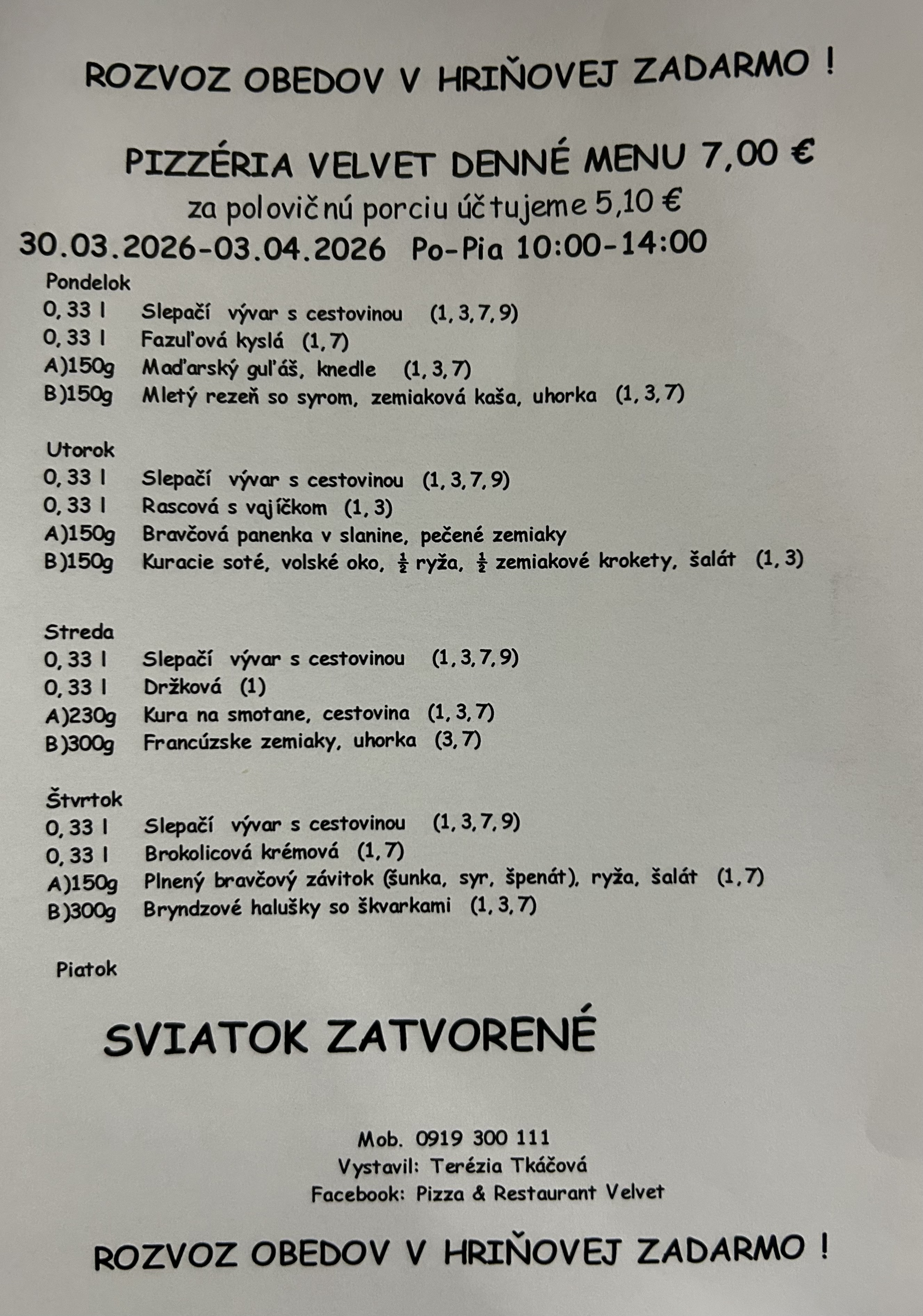 Pizzeria Velvet vás srdečne víta v Hriňovej! Pripravte sa na to, že vás očarí náš lahodný výber slovenskej kuchyne. Zažite úžasnú novú kuchyňu, ktorú podáva náš priateľský personál. Zoberte svojich priateľov a rodinu, aby si vychutnali náše jedlá pripravované s láskou. Môžete si u nás dopriať aj naše lahodné palacinky. K jedlu si môžete dať aj osviežujúce pivo, kávu a čaj. Pohodlne sa usaďte, relaxujte a vychutnajte si obed a večeru v našej vynikajúcej reštaurácii.